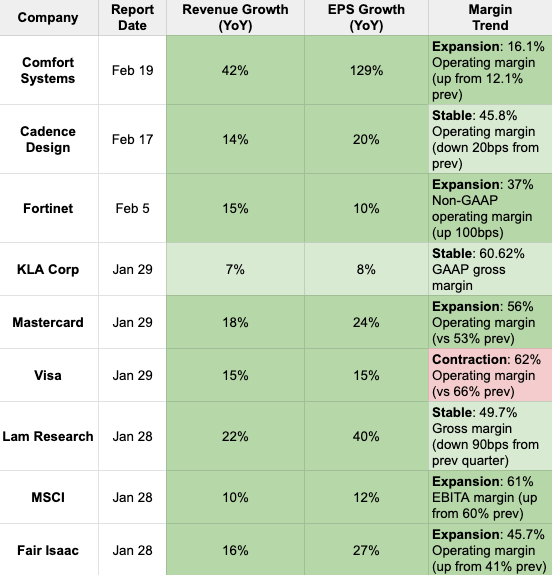 We've recently seen annual reports from Fortinet, Cadence Design System and Comfort Systems USA - and they did not disappoint. The below table breaks down the earnings releases for 9 of the 10 companies in the Long Equity portfolio. The final company, NVIDIA, releases their earnings this Wednesday.