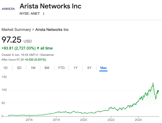 - Since its IPO in 2014, Arista's share price has grown by 2,727%.