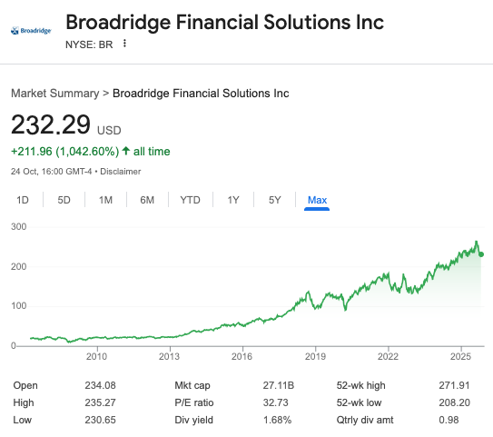 Broadridge Financial Solutions (Ticker:BR) is a financial services company that, since its 2007 IPO, has seen its share price grow by over 1000% - and with fairly solid linearity too.