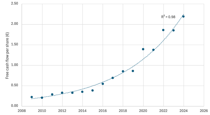 Nemetschek's mostly SAAS-derived revenue, means growth is impeccably consistent. FCF per share growth has grown 17% per annum over the last 15 years, which when fitted with an exponential curve, has an RSq value of 0.98 (note that the closer the value is 1.00 the more perfect the correlation).