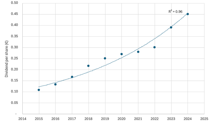 Nemetschek consistently retains its profits to reinvest for future growth. Their dividend payout is typically around 20% of free cash flow. Over the last 15 years, the dividend has grown at a similar rate to FCF (over 15% per annum), with an exponential RSq of 0.96.
