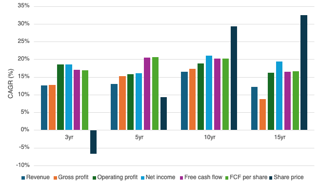 Nemetschek has seen consistent top to bottom growth. Revenue grow is consistently above 10% per annum and free cash flow per share growth is consistently above 15%. This has often translated into double-digit share price growth, although not in the last few years - suggesting a rerating, making the company more attractively valued.