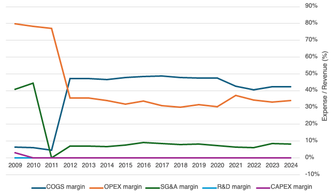 Nemetschek is clearly a company that has its expenses under control. The below chart breaks down its expense margins. Cost of goods sold (COGS) and operating expenses (OPEX) have been fairly flat over the last decade.