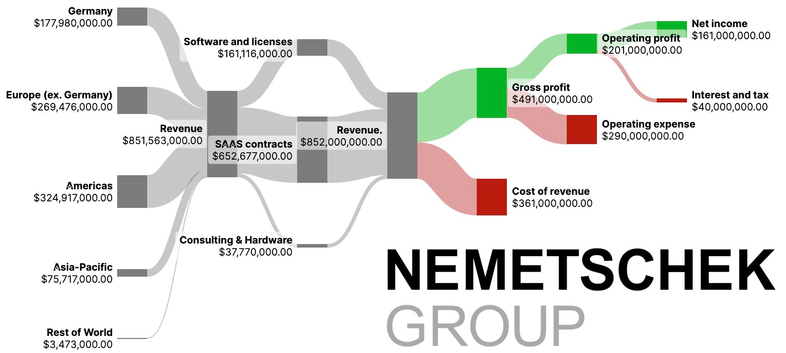Nemetschek has a fairly diversified and recurring revenue stream. They have around 7 million users from across 142 countries. Many of Nemetschek's brands are still transitioning to the SAAS, meaning that revenue should continue to become even more recurring in the years to come. The below Sankey diagram provides a geographic and product/service breakdown of the company's revenue. It demonstrates that Nemetschek is fairly diversified globally, with the majority of their revenue coming from long-term SAAS contracts.