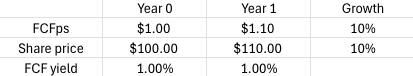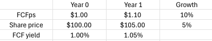 And if FCFps grows by 10% and the share price only goes up by 5%, then not only has the share price gone up, but the FCF yield has also gone up.