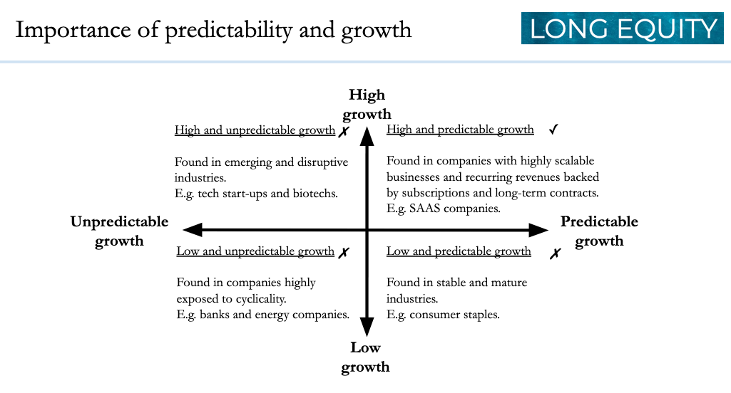 In my view, the ideal company to invest in is one that sits at the intersection of high growth and predictable growth (see below).